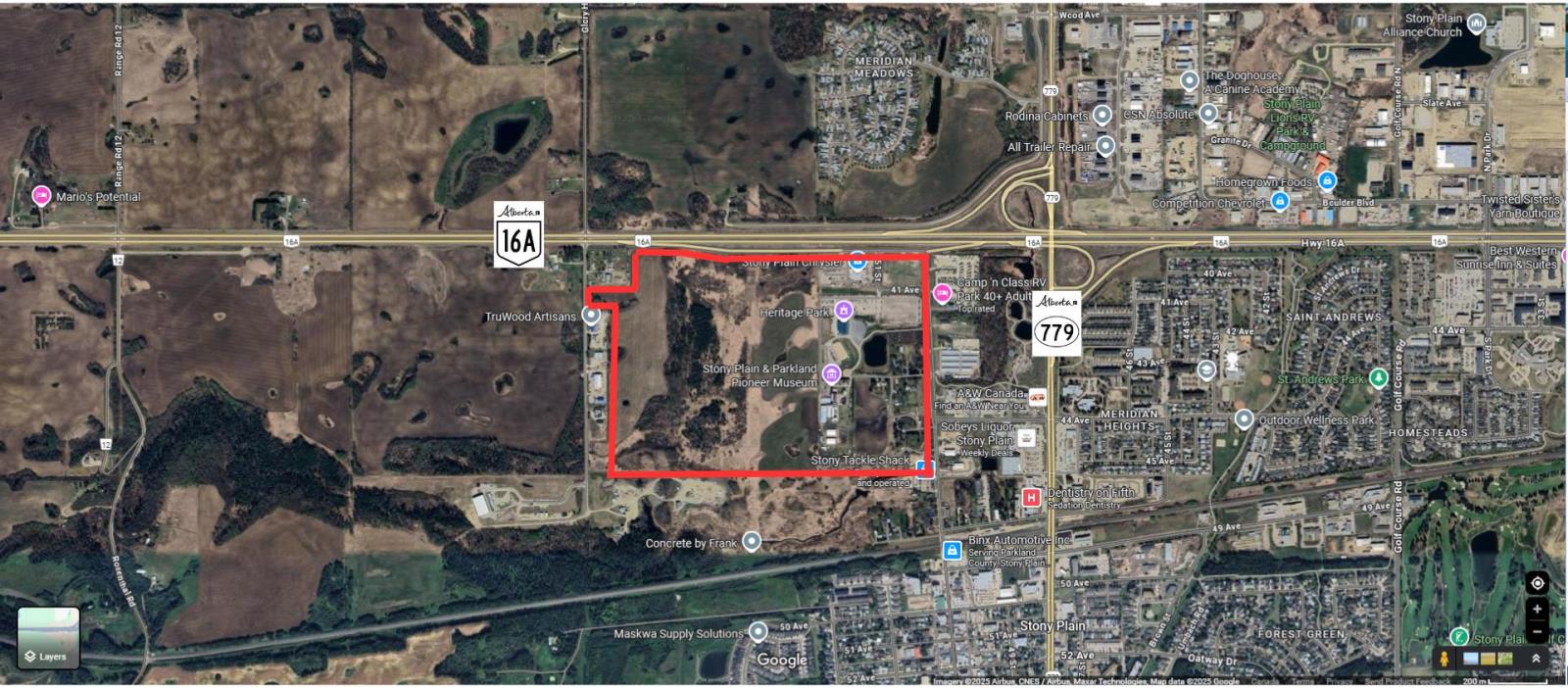 Prime development opportunity with this 140+/- acre parcel situated within the Town of Stony Plain, boasting approximately 2,200 feet with future access via Highway 16A and Glory Hills Road. With unparalleled visibility and exposure to over 23,000 vehicles per day on Highway 16A, an additional 11,500+ vehicles on Highway 779, this site is ideally positioned for large-scale commercial development. Zoned FD - Future Development, this land is a strategic investment for developers seeking to capitalize on Stony Plains ongoing growth. This property benefits from proximity to existing municipal services and established amenities, including Stony Plain Chrysler, Heritage Park Pavilion, and Campn Class RV Park. Notably, this site is located just west of the future Costco development, adding even more appeal and long-term value to the area. When combined with the parcel directly across Glory Hills Rd (52532 Glory Hills Rd), the two sites together would offer approximately one full mile of highway frontage (id:49203)